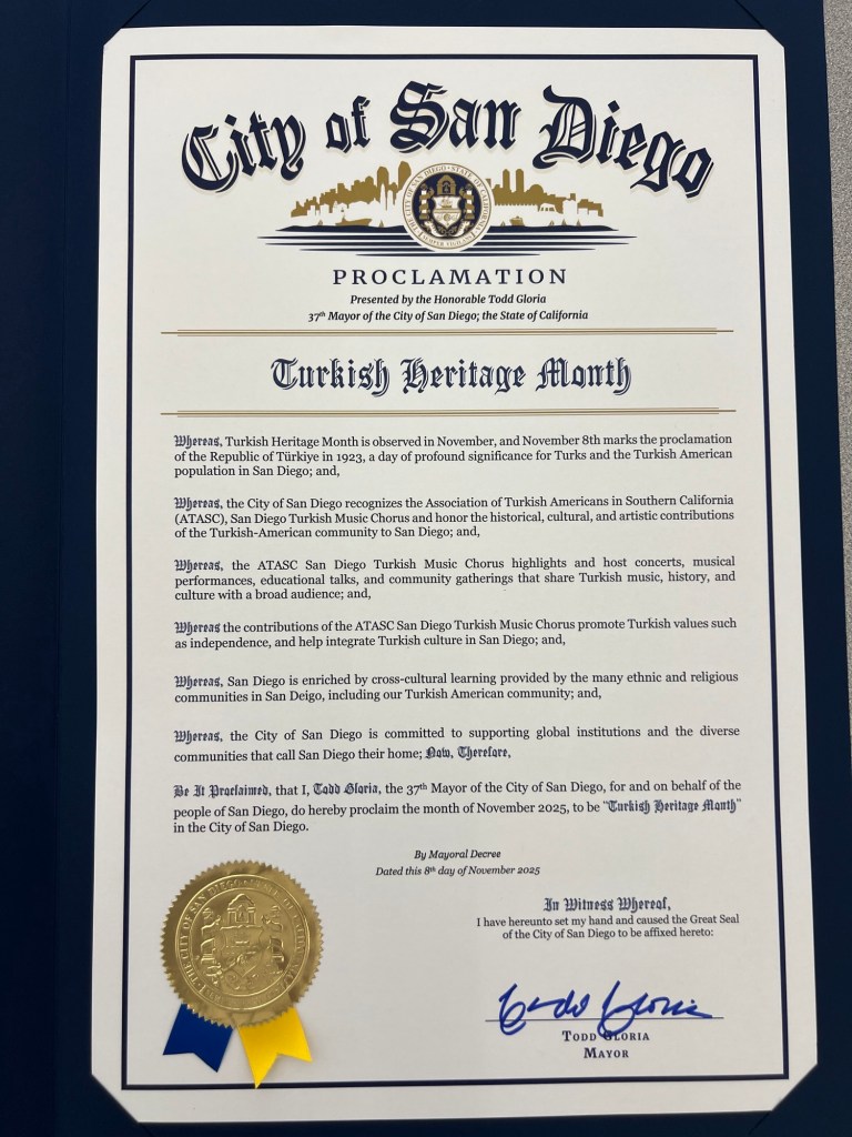 We are proud and delighted to share that, through the efforts of the ATASC-SD San Diego Turkish Music Chorus, the City of San Diego has officially proclaimed next month as “Turkish Heritage Month.” 🎉